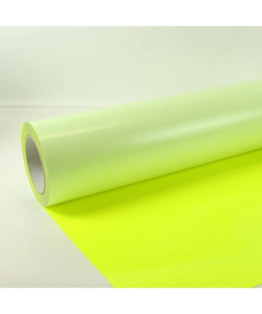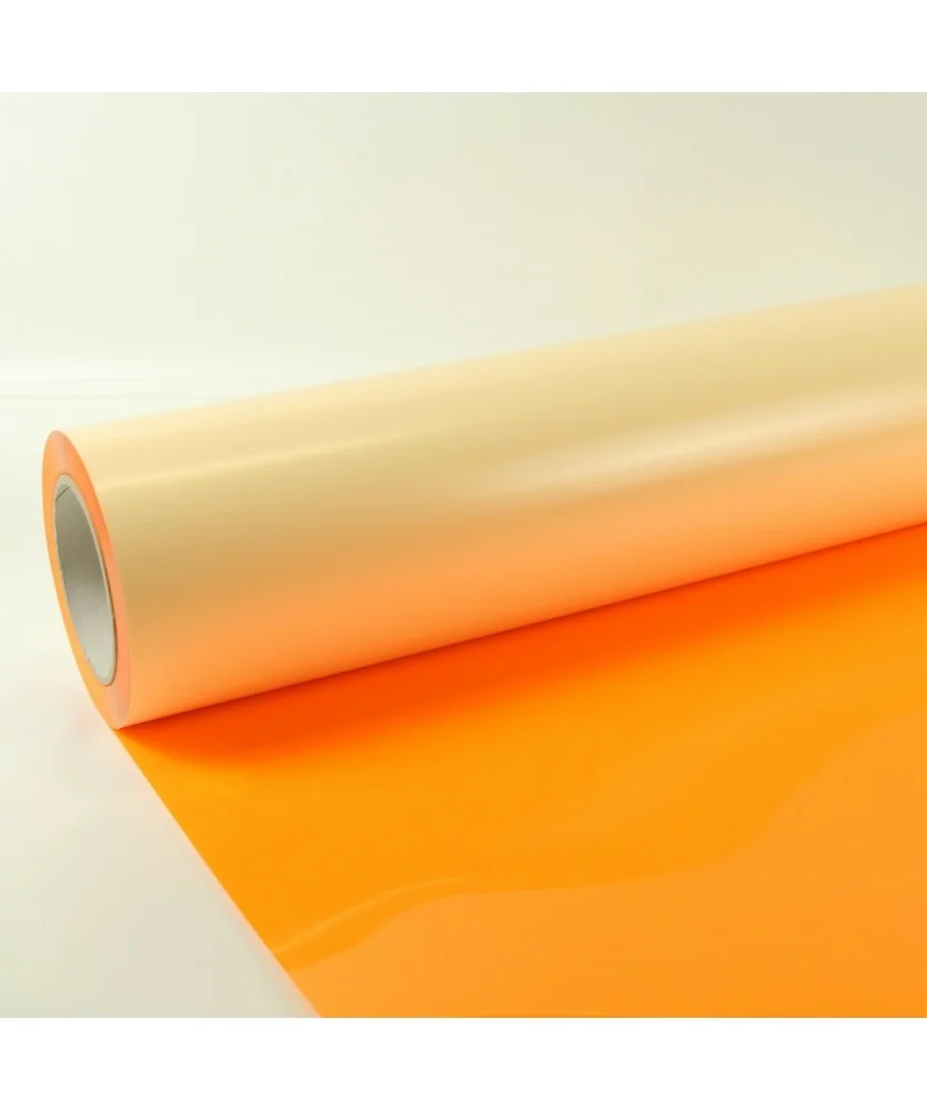 Film PU fluo 70µ per tessuti. Alta visibilità, morbido al tatto, lavabile a 60°C. Bobina h50 cm, colori vivaci.